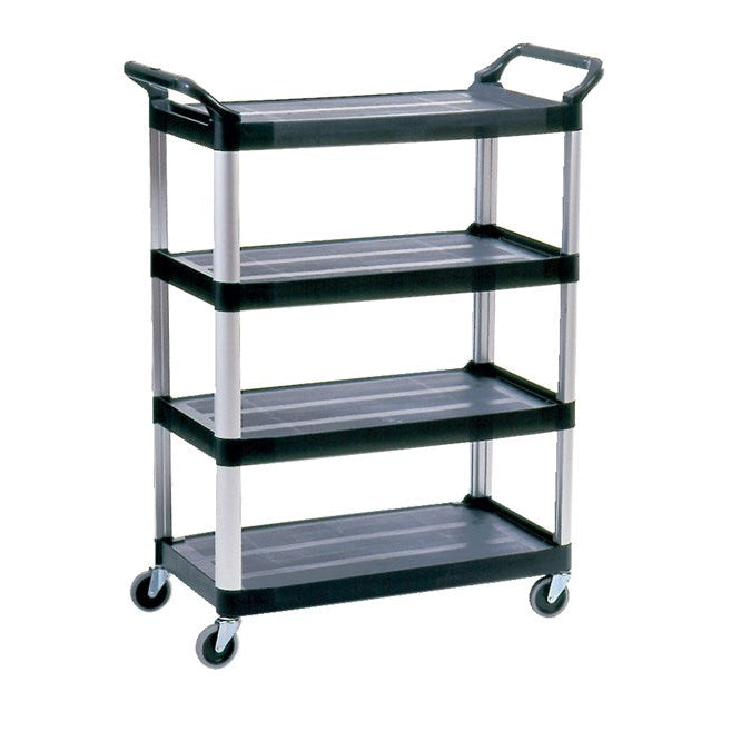 El carrito de 4 estantes con lados abiertos Rubbermaid Commercial Products Xtra™ es un carrito de almacenamiento y transporte duradero para aplicaciones de fachada y trastienda. Diseñado para transportar cargas grandes, este carro utilitario con ruedas tiene ruedas giratorias resistentes para un movimiento suave y brazos elevados en ambos lados para mayor maniobrabilidad. Los grandes estantes texturizados contienen una variedad de equipos y suministros, de hasta 300 libras.