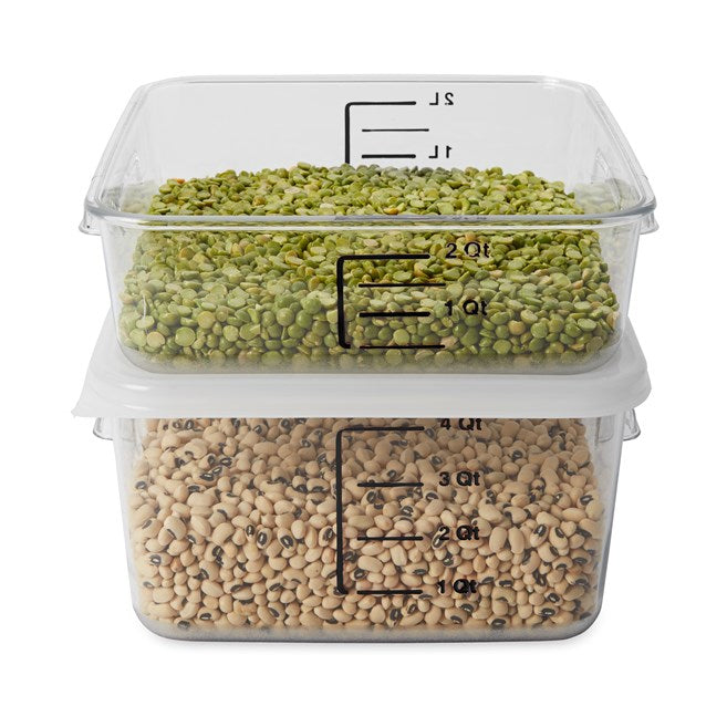 El contenedor de almacenamiento de alimentos Rubbermaid Commercial que ahorra espacio, 4 cuartos, transparente, mantiene los alimentos frescos, organizados y listos para usar. Con medidas graduadas fáciles de leer en azul para litros y rojo para cuartos, estos recipientes de plástico para almacenamiento de alimentos facilitan la medición del contenido. Porque creemos que los mejores recipientes para almacenar alimentos utilizan el espacio de manera eficiente, hemos diseñado estos recipientes de plástico con una forma cuadrada que ofrece un 25 % más de capacidad de almacenamiento que los recipientes redondos. Construidos con policarbonato resistente a roturas, tienen un rango de temperatura de -40°-212°F, lo que los hace perfectos para todo, desde almacenamiento en el congelador hasta cocción al vacío. Apto para lavavajillas comercial, cuentan con asas duraderas con orificios de drenaje para un lavado y secado adecuados. Certificado por el USDA para contacto con alimentos, ayuda a cumplir con las pautas HACCP y cuenta con la certificación NSF 3-A para equipos para carnes y aves de corral y NSF 2.