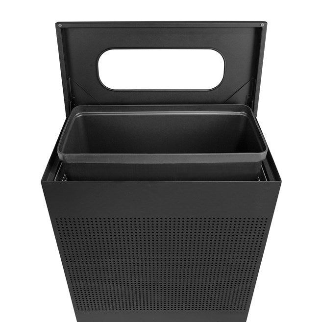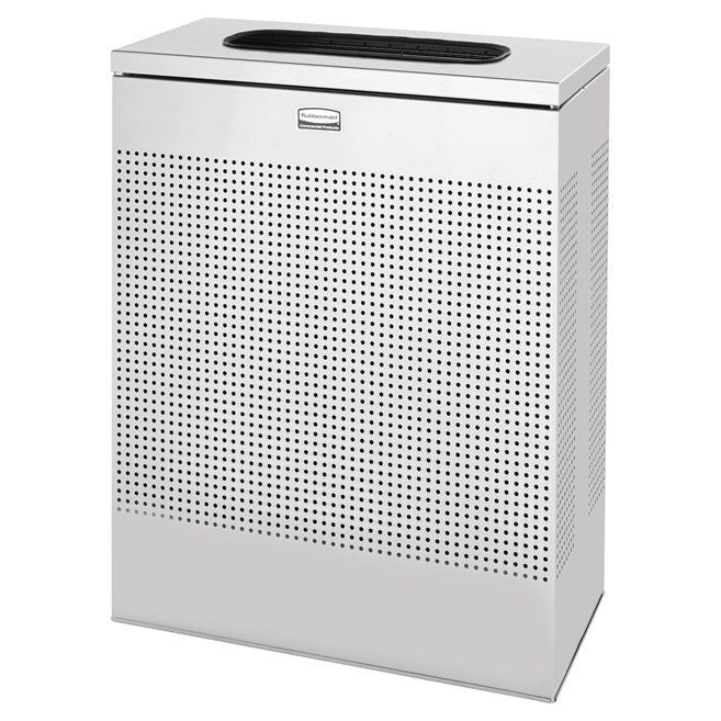 El elegante contenedor rectangular decorativo para residuos de interiores Silhouettes FGSR18 de 22.5 galones presenta un diseño perforado contemporáneo que se integra a la perfección con instalaciones y entornos modernos. Está fabricado en acero ignífugo de gran espesor, con la tapa fijada al contenedor, lo que agiliza y facilita la recolección de residuos. Los niveladores de patas proporcionan estabilidad en superficies irregulares e incluye un forro de plástico rígido a prueba de fugas. Las bandas de retención plegables mantienen las bolsas de forro en su lugar y ocultas. El contenedor se entrega completamente ensamblado, lo que facilita y agiliza su instalación.